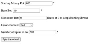 This was created to simulate playing all in just on black, red, or random to test the Martingale theory which could be used if it weren’t for maximum bet often present