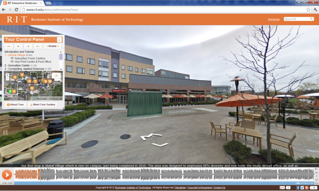 The traditional college virtual tour tends to be an overhead clickable map; a far different experience from a real world tour experience. After the Google Streetview Trike visited RIT, the Undergraduate Admissions office set out to create an immersive and interactive tour experience.